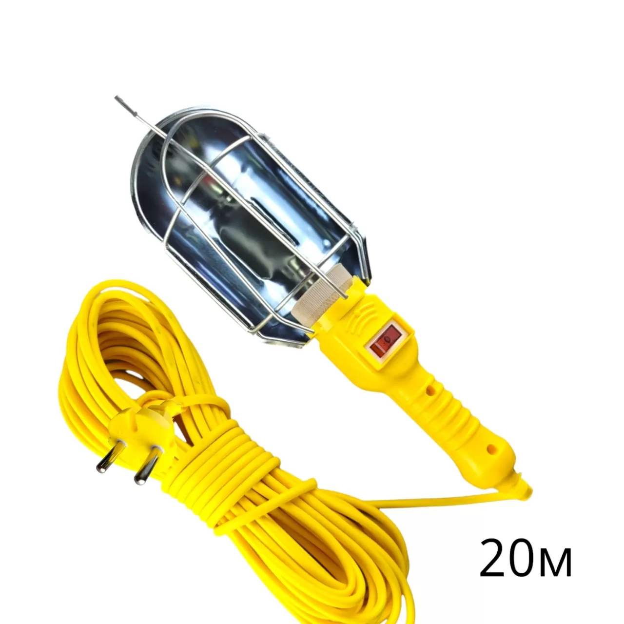 Подвесной светильник для гаража 20 метров оборудован керамическим цоколем Е 27 для ламп накаливания. Работает от сети переменного тока с напряжением до 220 В. Переносная лампа для гаража выполнена из жаропрочного и антикоррозийного купола и удобной ручки из ABS-пластика, на которой расположен клавишный выключатель. Защитная стальная решетка предохраняет лампу от ударов.