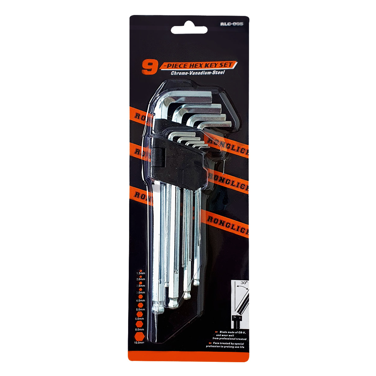 Набор состоит из 9-ти торцевых шестигранных Г-образных ключей с шаровидным наконечником 1,5-10 мм. Ключи предназначены для откручивания и закручивания крепежных изделий, имеющих в головке внутренний шестигранник.