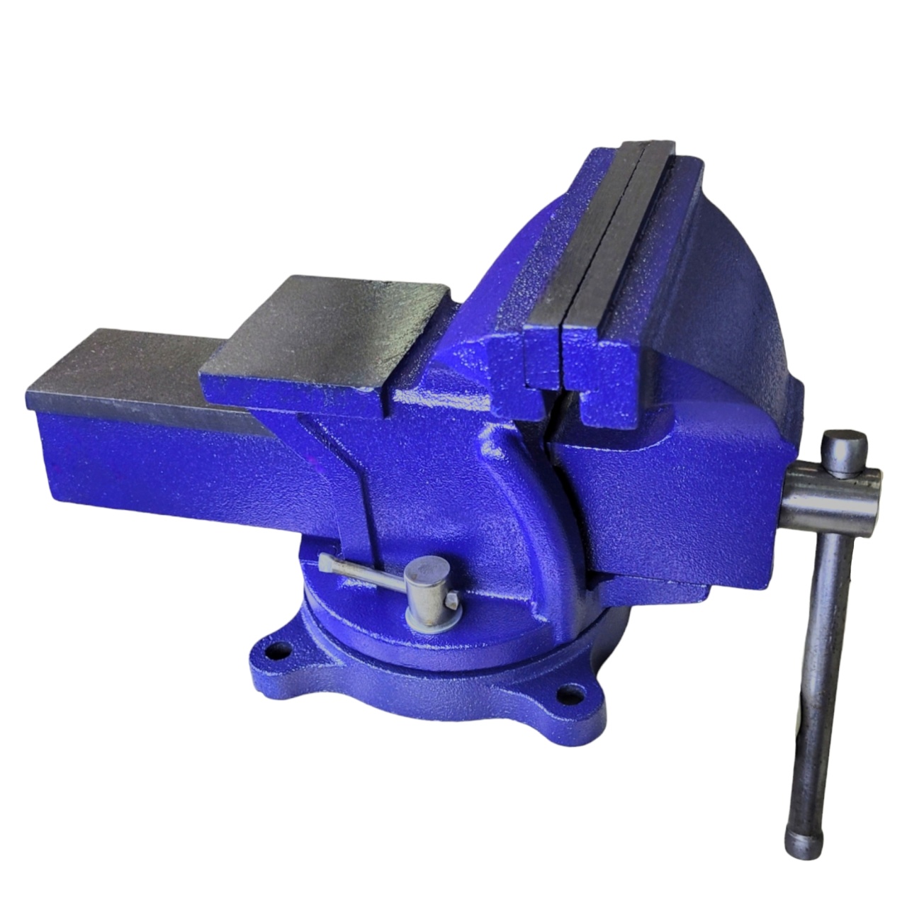 Массивный чугунный корпус и основание покрыты краской, защищающей тиски от коррозии и увеличивая их рабочий ресурс. Корпус может вращаться на 360° относительно основания, именно это способствует удобной обработке заготовки. Наличие наковальни расширяет функциональные возможности слесарных тисков.