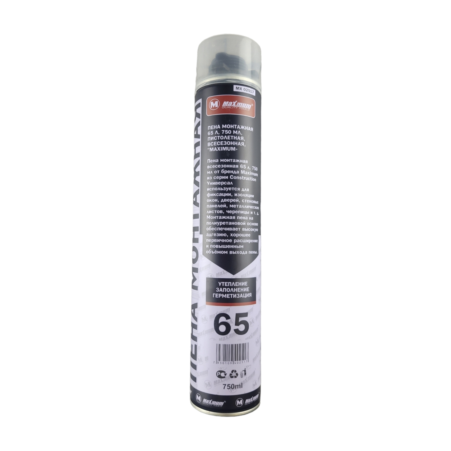 Пена монтажная 65 л 750 мл от бренда Maximum из серии Construction Универсал используется для фиксации, изоляции окон, дверей, стеновых панелей, металлических листов, черепицы и т. д.