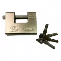 Навесной замок с автоматическим запиранием имеет надежный цилиндровый механизм и 3 евро ключа в комплекте. Вместо дужки у П-образного замка ригель из высокоуглеродистой стали, сильно углубленный в корпус. Когда замок подвешен, ригель почти целиком скрывается в корпусе и за проушинами.