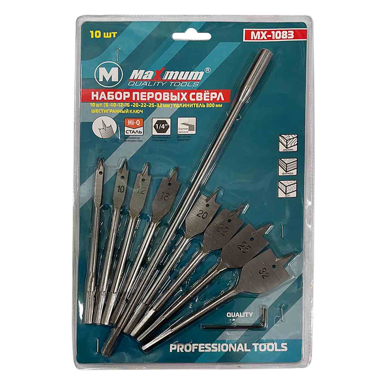 Набор от Maximum включает в себя 8 перьевых сверл разного размера, а также удлинитель и шестигранный ключ.